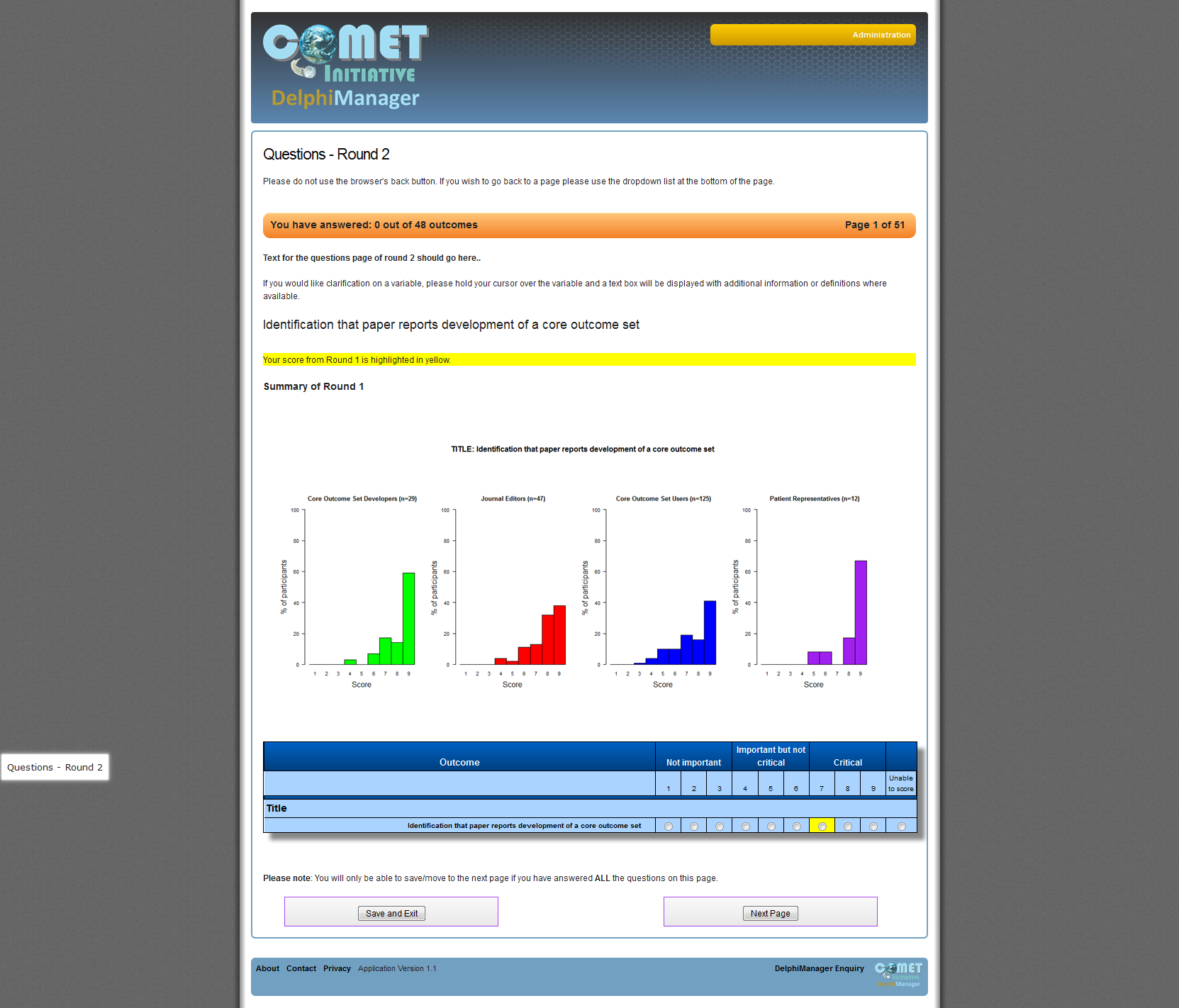 Round 2 graphs shows a different display type for round 2 where stakeholder panel results are displayed as graphs.